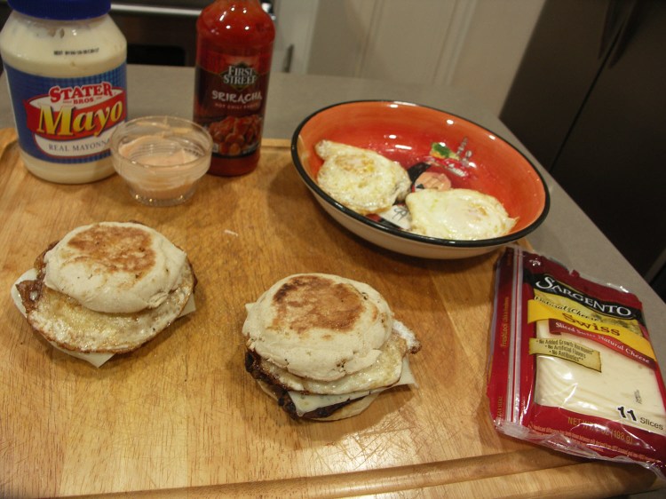 - Brush each toasted English muffin with just butter or add the mayo/siracha sauce and put patty assembly on the muffin and if you did not add chopped Jalapeno to the patty, now is the time to add the Jalapeno strips to the top or bottom of the sandwich . Prepare to be blown away.