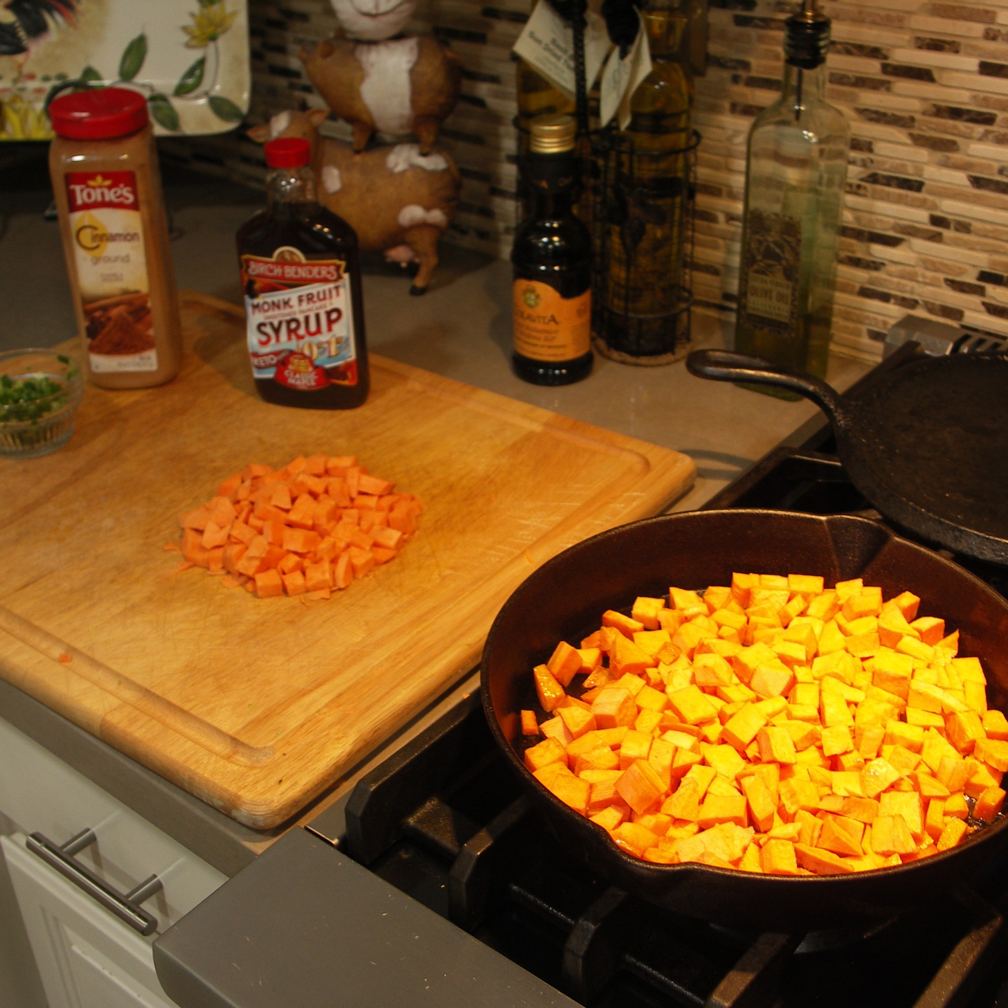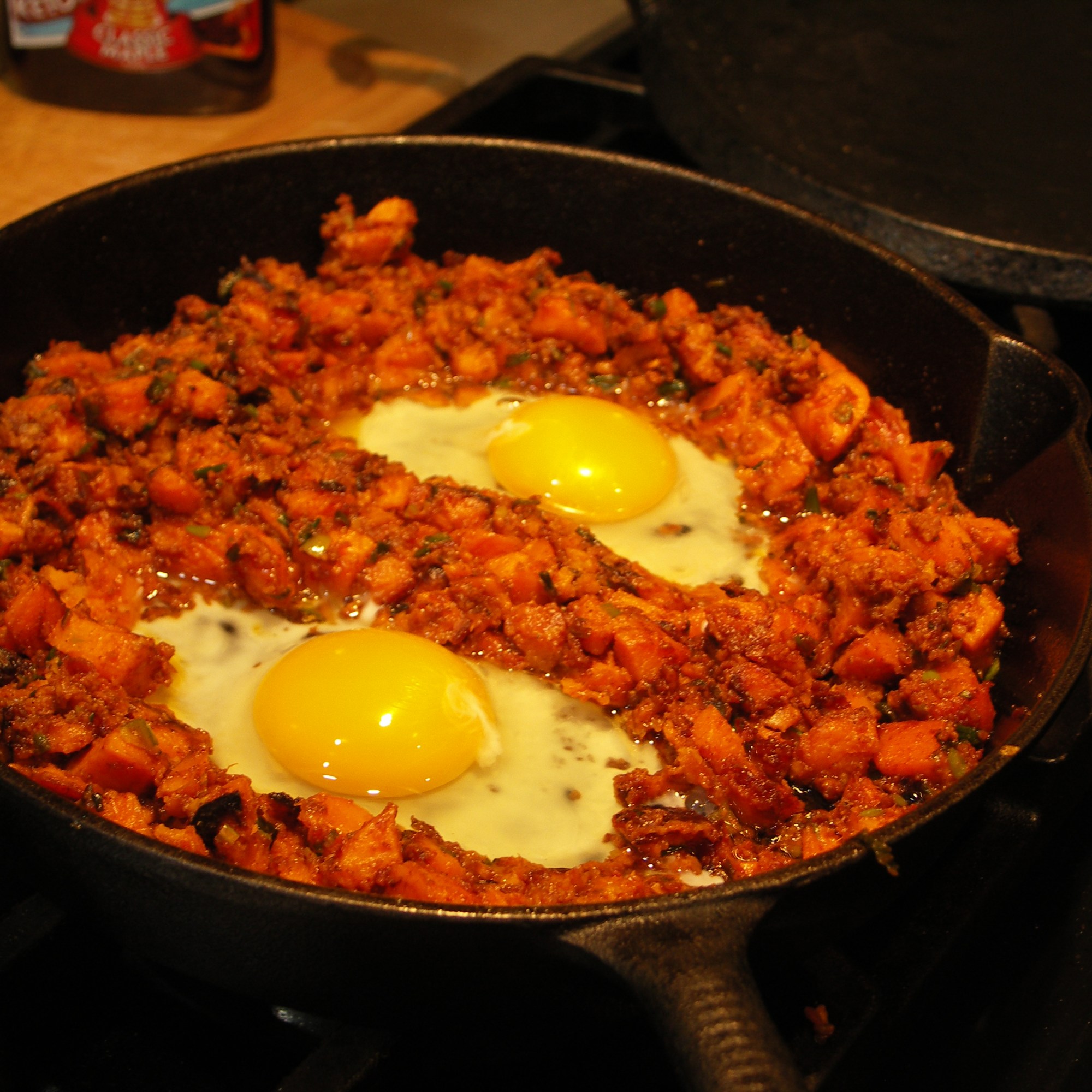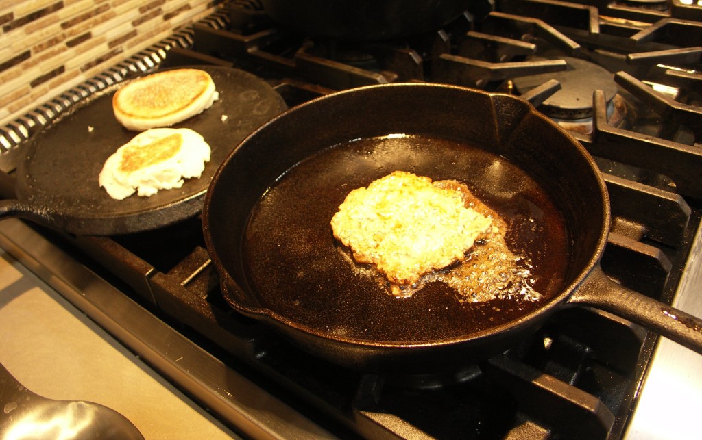 - Cook the patties and the eggs simultaneously. In the cast-iron skillet cook the pork until the interior reaches 145 degrees. While the meat is cooking, use the griddle to fry eggs in olive oil or butter (cook eggs to your liking! Over easy, medium, sunny side up…). If your skillet is big enough, you can cook it all in one pan for more flavor!